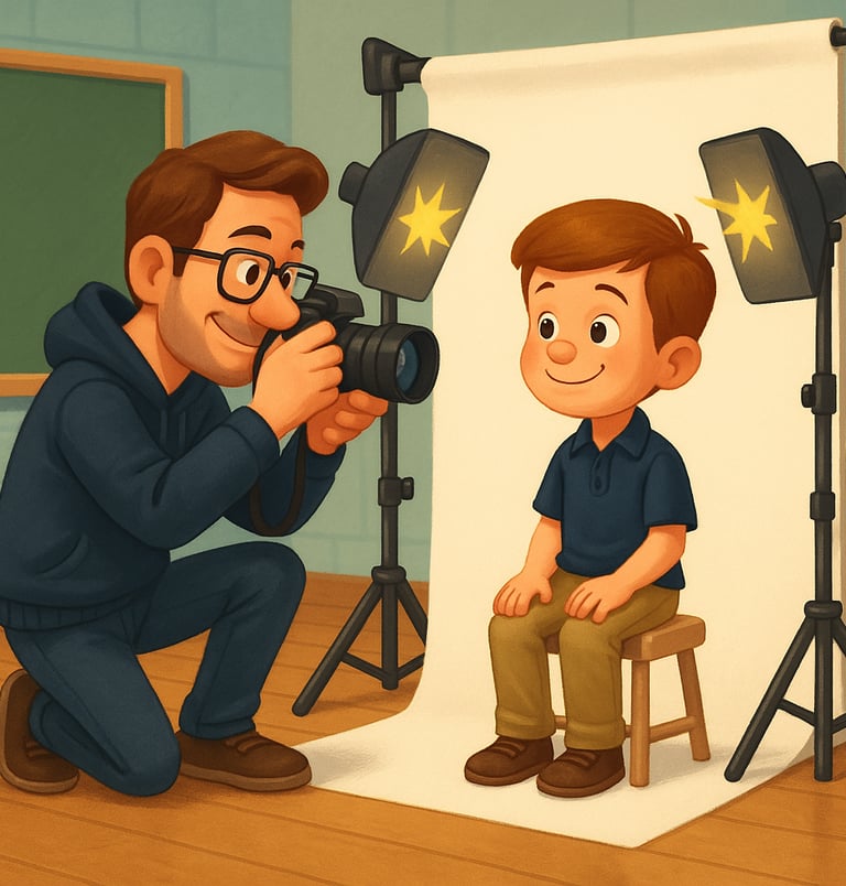 El día de las fotos, somos como duendes madrugadores. Llegamos antes de que los estudiantes estén en clase para preparar un estudio increíble. ¡Montamos todo un set profesional .